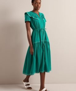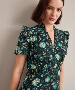 The Liliana dress flatters so many figures thanks to its V-neckline, high hip-skimming waist and softly shoulder-defining frill detailing. Designed in a beautifully drapey cotton viscose georgette that’s fully lined, it’s practical as well as pretty – the rouleau buttons are stitched down through the bust and waist to avoid gaping but can be opened at the bottom to show off more leg.
